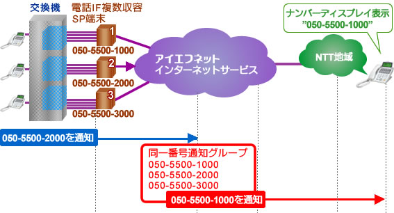 | 複数の050番号をグループ化し、そのグループから発信した場合に、相手に対して あらかじめ定めた特定番号を通知する、050IP電話の付加サービスです。 |
