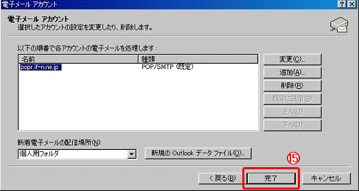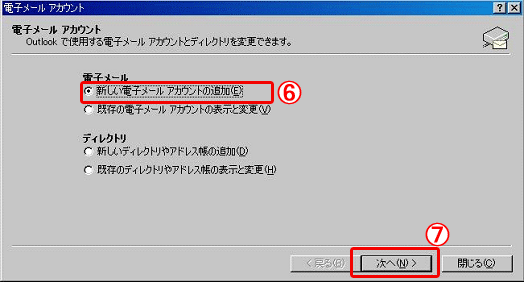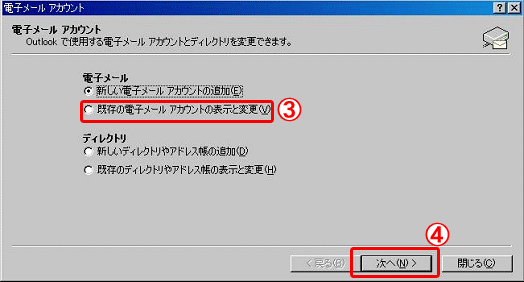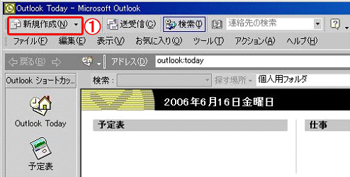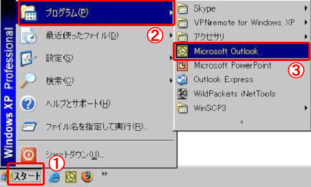 Microsoft Outlookが起動したら、メニューバーから[ツール①]→[電子メールアカウント②]をクリックしてください。