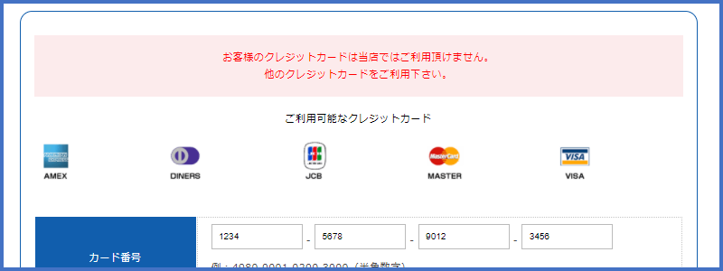 ※「お客様のクレジットカードは当店ではご利用頂けません。」が出た場合は入力情報に誤りがあるか、アイエフネットのお支払いにご利用出来ないクレジットカードです。