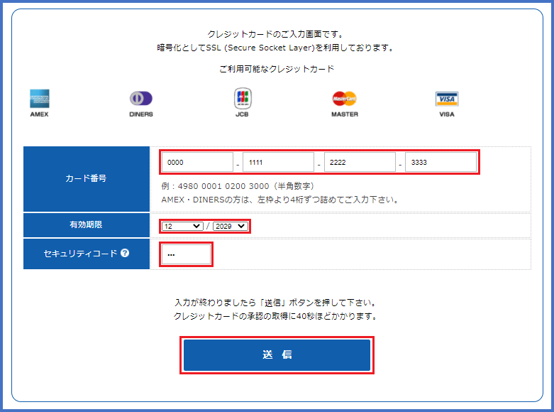 4:「カード番号」「有効期限」「セキュリティ番号」をそれぞれ入力し【送信】をクリックします。